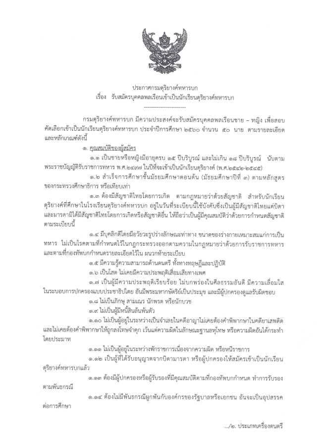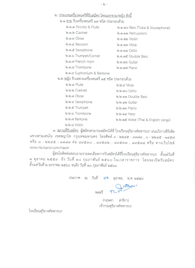 กรมดุริยางค์ทหารบก รับสมัครบุคคลพลเรือนชาย-หญิง เพื่อสอบคัดเลือกเข้าเป็นนักเรียนดุริยางค์ทหารบก ประจำปีการศึกษา 2560 จำนวน 50 นาย เปิดรับสมัคร 2 ม.ค.-10 ก.พ.59 รายละเอียดดังนี้