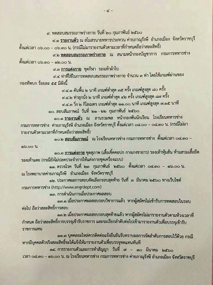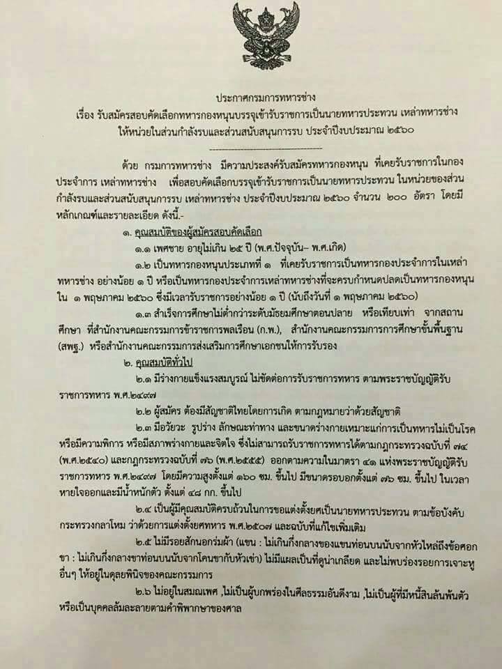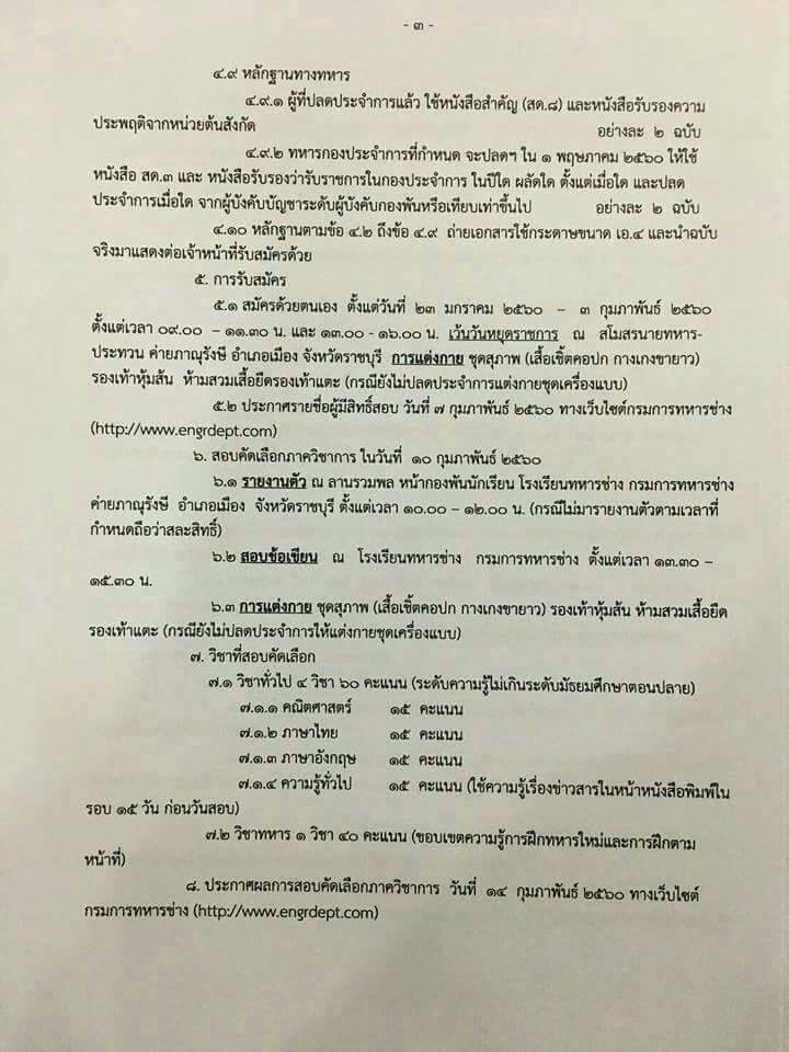 กรมการทหารช่าง รับสมัครสอบคัดเลือกทหารกองหนุนบรรจุเข้ารับราชการเป็นนายทหารประทวน เหล่าทหารช่าง ให้หน่วยในส่วนกำลังรบและส่วนสนับสนุนกำลังรบ ประจำปีงบประมาณ 2560 จำนวน 200 อัตรา เปิดรับสมัคร 23 ม.ค.-3 ก.พ.60 ณ สโมสรนายทหารประทวน ค่ายภาณุรังษี อ.เมือง จ.ราชบุรี สอบถามรายละเอียดเพิ่มเติมได้ที่ กองกำลังพล กรมการทหารช่าง ค่ายภาณุรังษี อ.เมือง จ.ราชบุรี โทร. 0-3222-7014 ต่อ 53125, 53124 หรือ 084-5670066 ในเวลา 8.30-16.00 น.