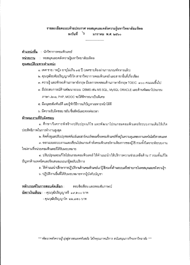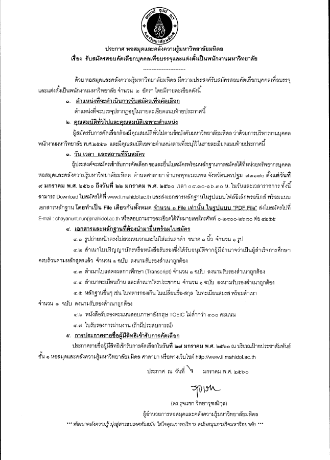 The post (สมัครทางอีเมล์ได้)หอสมุดและคลังความรู้ ม.มหิดล รับสมัครงานวุฒิ ป.ตรี/โท บัดนี้-22ม.ค.60 appeared first on ThaiJobsGov.com.