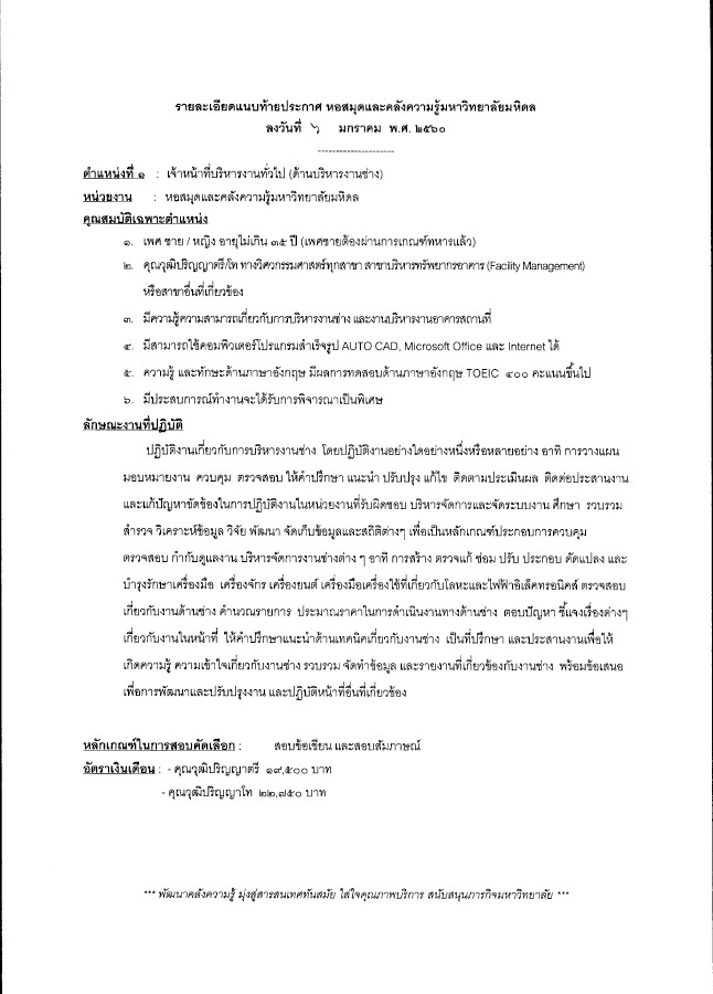 หอสมุดและคลังความรู้ มหาวิทยาลัยมหิดล รับสมัครสอบคัดเลือกบุคคลเพื่อบรรจุและแต่งตั้งเป็นพนักงานมหาวิทยาลัย 2 อัตรา ตำแหน่งเจ้าหน้าที่บริหารงานทั่วไป (ด้านบริหารงานช่าง) และตำแหน่งนักวิชาการคอมพิวเตอร์ คุณวุฒิ ปริญญาตรี/ปริญญาโท เปิดรับสมัคร 9-22 ม.ค.60