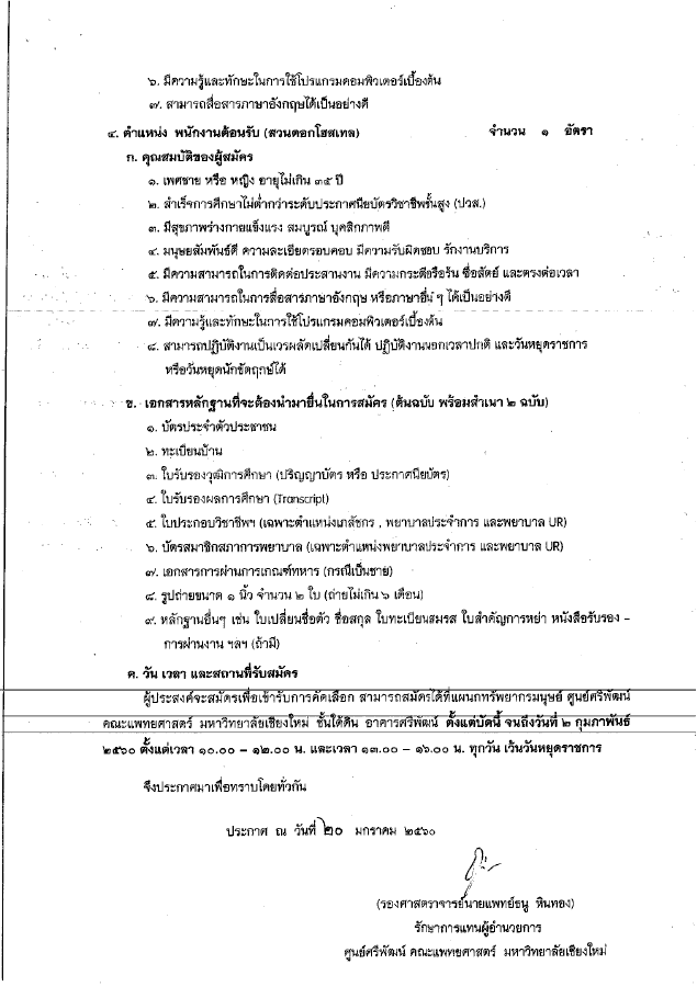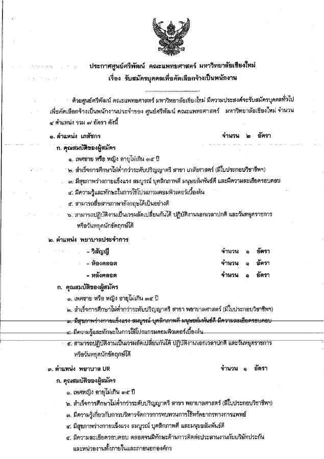 ศูนย์ศรีพัฒน์ คณะแพทยศาสตร์ มหาวิทยาลัยเชียงใหม่ รับสมัครบุคคลเพื่อเลือกจ้างเป็นพนักงาน 4 ตำแหน่ง 7 อัตรา คุณวุฒิ ปวส./ป.ตรี บัดนี้-2 ก.พ.60