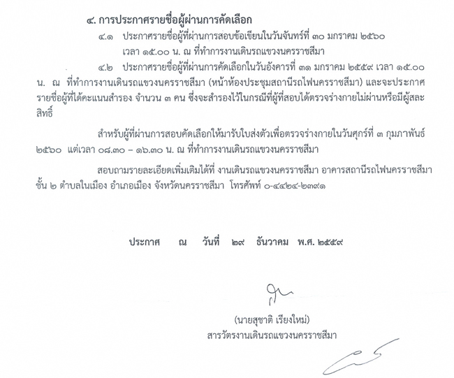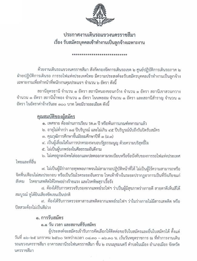 การรถไฟแห่งประเทศไทย โดยงานเดินรถแขวงนครราชสีมา รับสมัครบุคคลเข้าทำงานเป็นลูกจ้างเฉพาะงานเพื่อทำหน้าที่พนักงานคุมประแจ 6 อัตรา เพศชาย วุฒิ ม.3 เปิดรับสมัคร 16-25 ม.ค.60